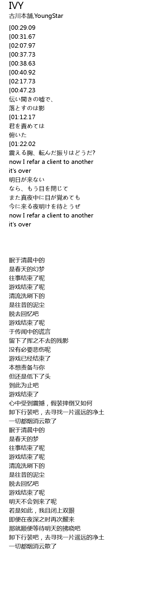 | [02:10.46][02:07.97][00:36.11][00:33.42] | this game is over |