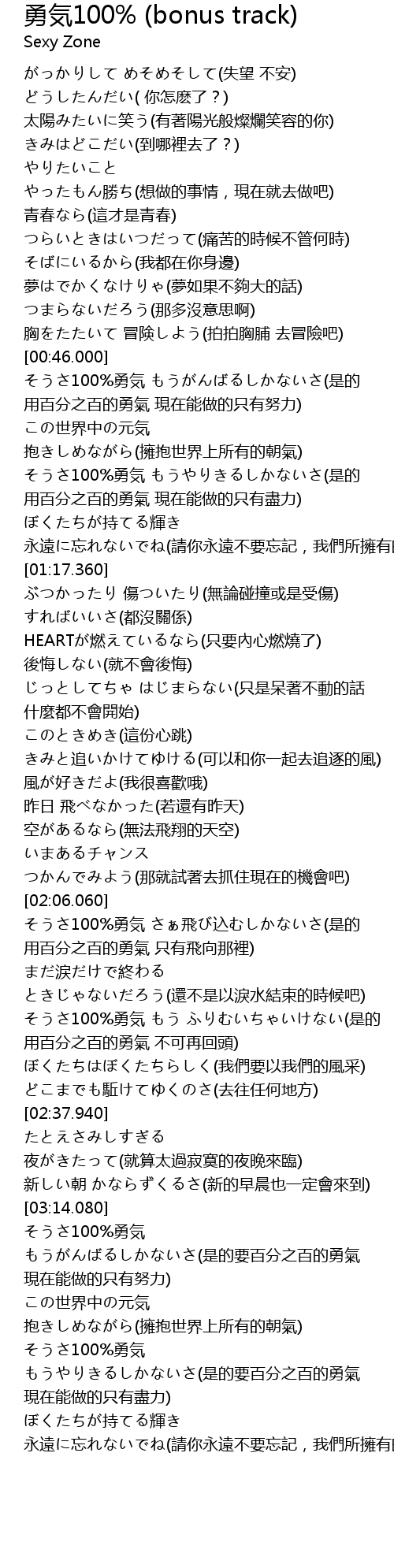 | [00:46.320] | そうさ100%勇気 もうがんばるしかないさ(是的 用百分之百的勇氣 現在能做的只有努力) |