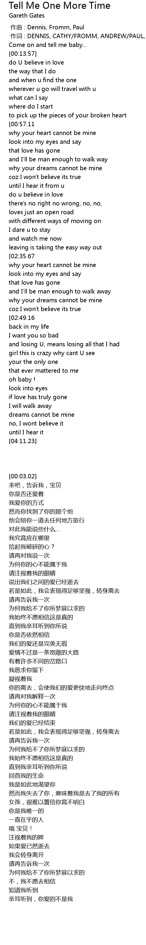| [03:40.79][02:35.67][02:14.74] | tell me one more time |
