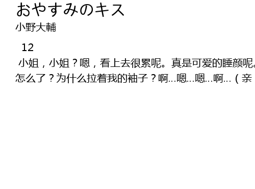 | xiǎo jiě, xiǎo jiě? , kàn shang qu hěn lèi ne. zhēn shì kě ài de shuì yán ne. hěn xiǎng jiù zhè yàng bǎ nǐ màn màn jiào xǐng. zài zhè zhòng dì fāng shuì jiào kě shì yòu huì gǎn mào de ó. qīn hǎo le, zhuā dào le. a bǎ nǐ dài dào chuáng shǎng qù shuì ba. a guǒ rán hěn qīng ne. bào zhe nín gǎn jué jiù xiàng huì zhé duàn shì de. ? hā nín kàn qǐ lái hěn kùn ne. qīn lái, dào le ó. shuì dào bèi zi lǐ, bié zháo liáng le. ? zěn me le? wèi shí me lā zhe wǒ de xiù zi? a a qīn wǒ bù xíng de. wǒ bù néng duì xiǎo jiě zuò chū zhè zhǒng shì. dàn shì, yǒu nín zhè fèn xīn yì, wǒ jiù hěn kāi xīn le. a wǒ yǐ jīng zuò hǎo xīn lǐ zhǔn bèi le. yīn wèi bì jìng wǒ yě shì gè nán rén ma. zài tiān liàng zhī qián wǒ huì yī zhí zài zhè lǐ. wǎn ān zhī wěn qīn wǒ yǐ jīng, bú huì tíng zhǐ le. qīn |