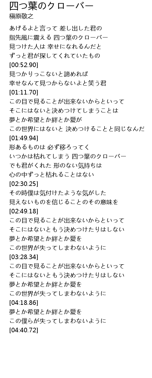 | [00:27.32] | 指先風に震える 四つ葉のクローバー |