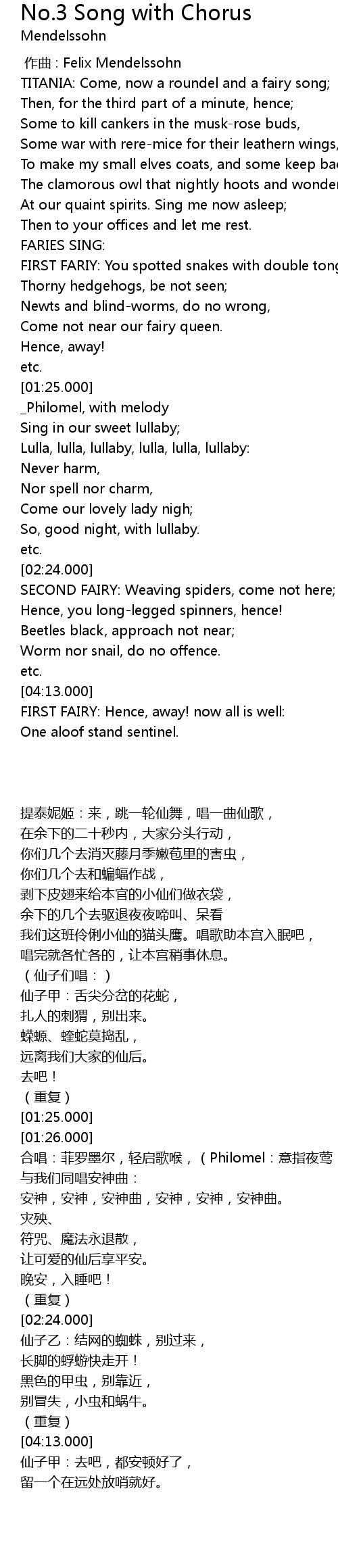 | [02:33.000] | SECOND FAIRY: Weaving spiders, come not here; |