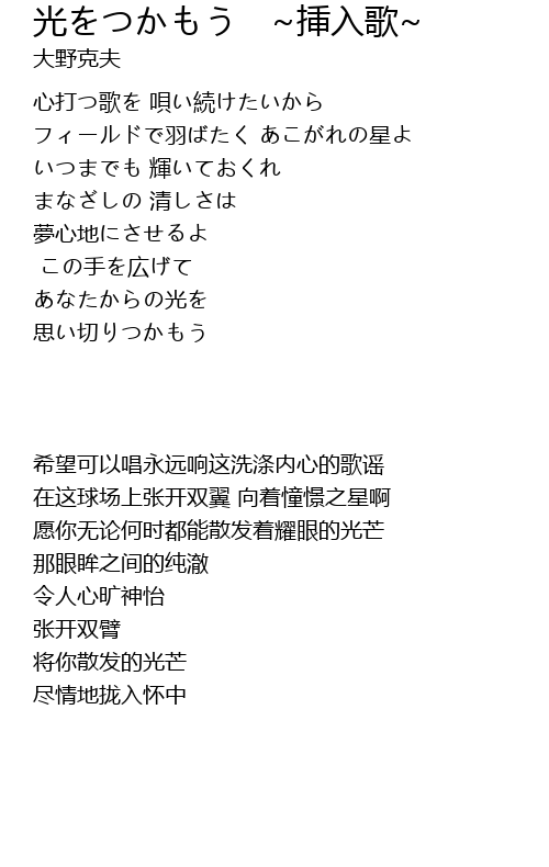 | [00:12.85] | フィールドで羽ばたく あこがれの星よ |