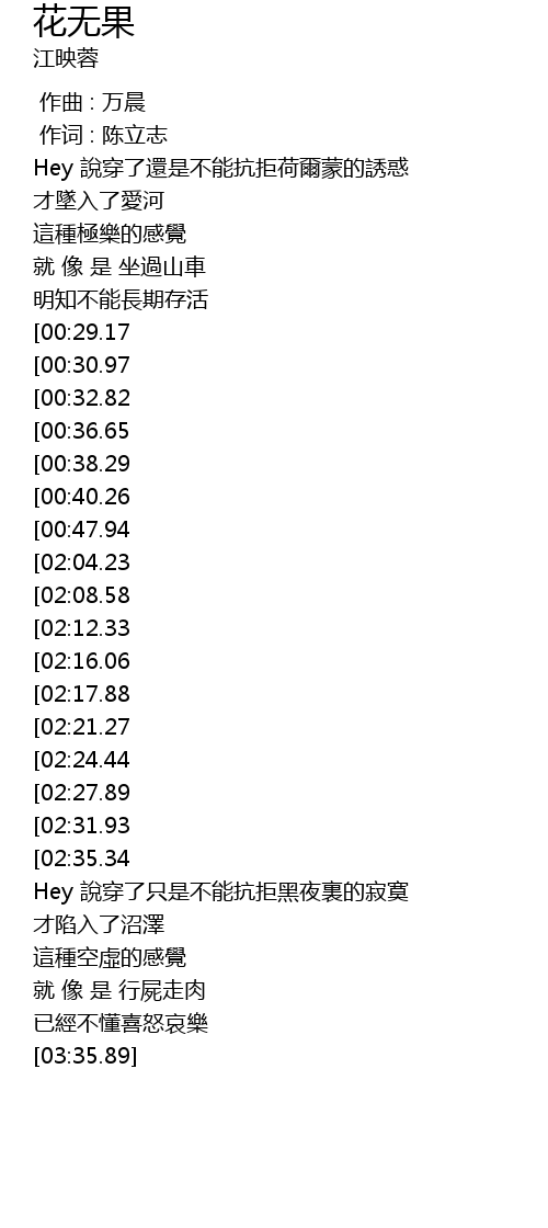 | [03:05.96][02:17.88][01:00.72] | 也結不了果(花無果) |