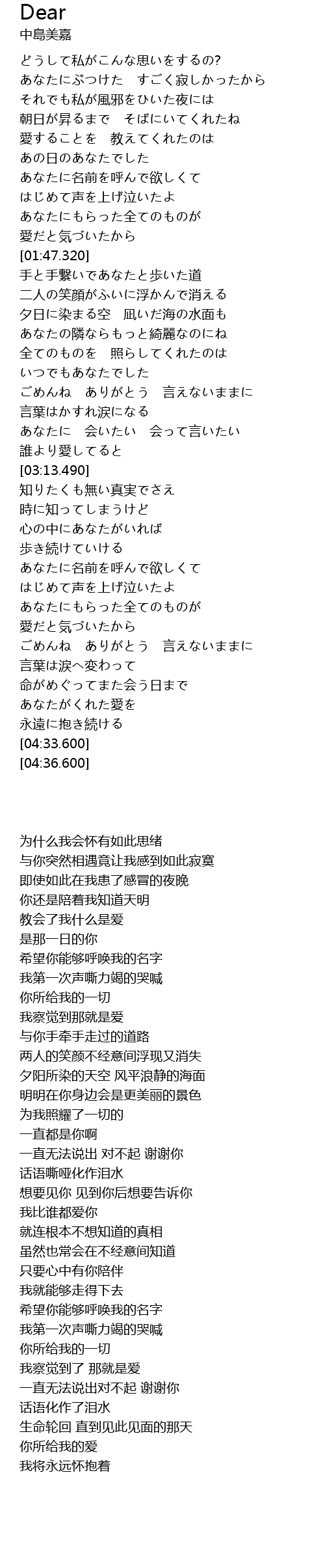 | [00:36.900] | あなたにぶつけた すごく寂しかったから |