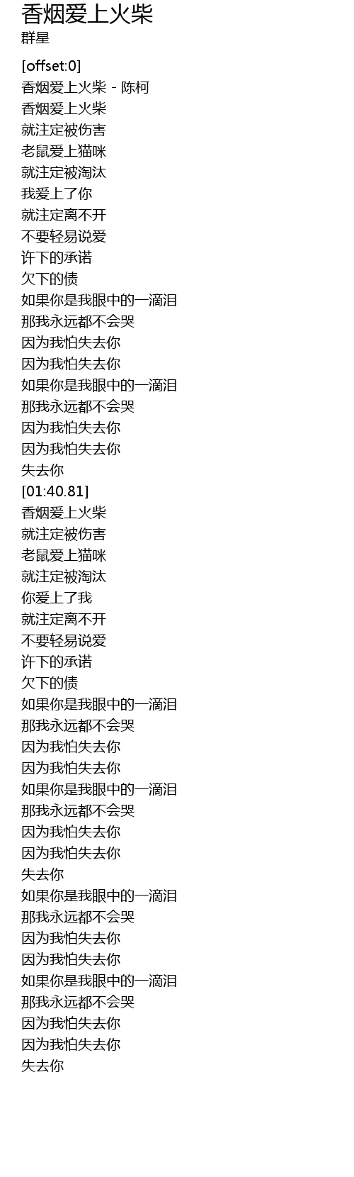 | [00:08.90] | 香烟爱上火柴 - 陈柯 |