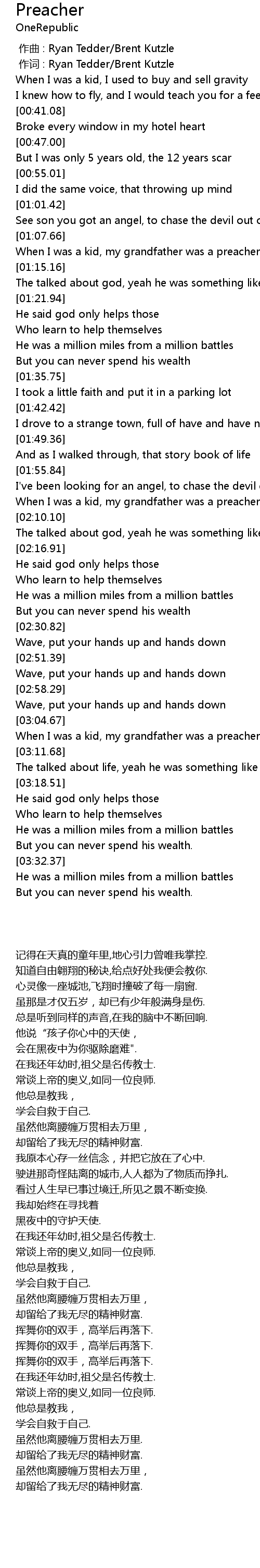 | [02:04.59] | When I was a kid, my grandfather was a preacher |