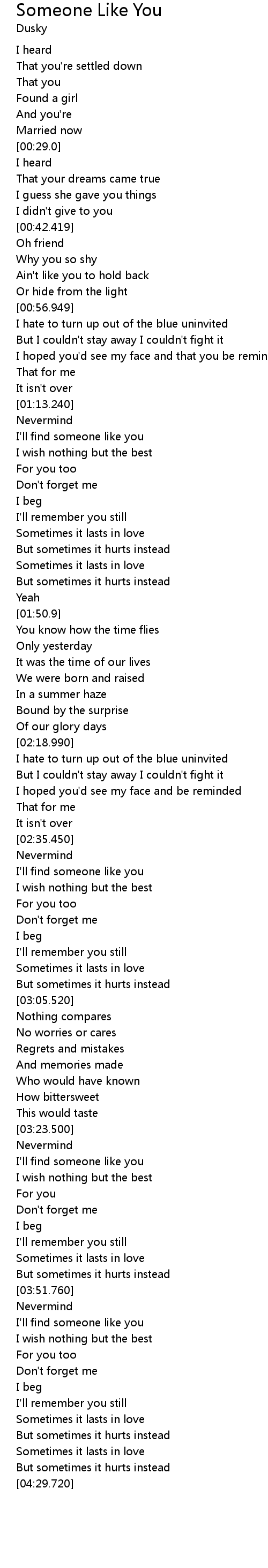 | [03:25.780] | I' ll find someone like you |