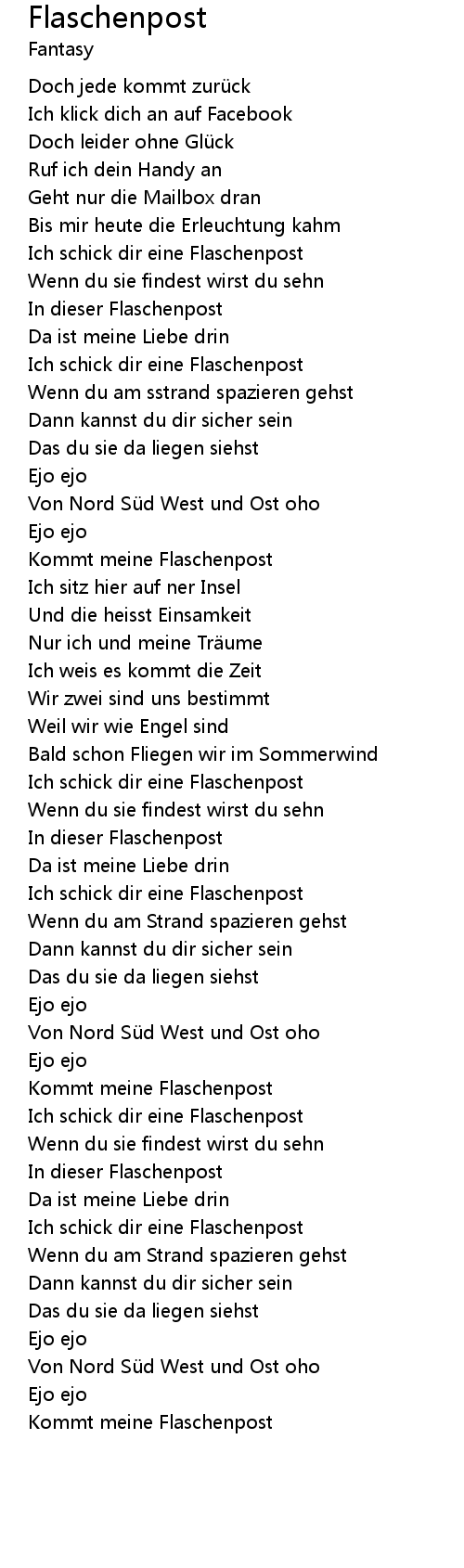 | [03:03.47] | Ich schick dir eine Flaschenpost |