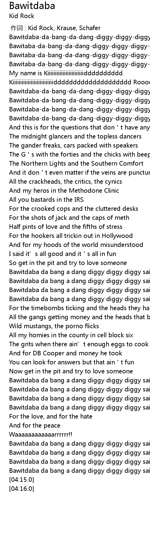 | [03:59.0] | Bawitdaba da bang a dang diggy diggy diggy said the boogy said up jump the boogy |