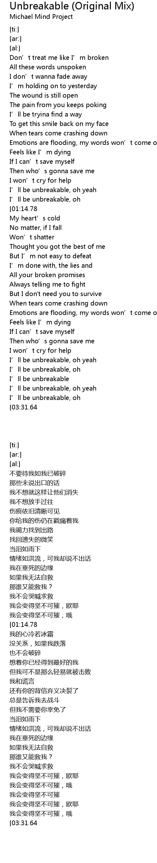 | [03:38.97][03:31.64][03:23.99] | I' ll be unbreakable |