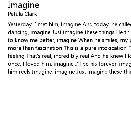 Yesterday, I met him, imagine And today, he called me, imagine Wants to take me dancing, imagine Just imagine these things He thinks I am lovely, imagine Wants to know me better, imagine When he smiles, my poor heart has wings It must be more than fascination This is a pure intoxication For I am reeling, amazed by a feeling That's real, incredibly real And he knew I loved him, imagine Knew at once, I loved him, imagine I'll be his forever, imagine Of the joy that loving him reels Imagine, imagine Just imagine these things |