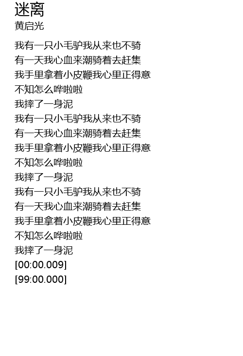 | [00:38.00] | 我有一只小毛驴我从来也不骑 |