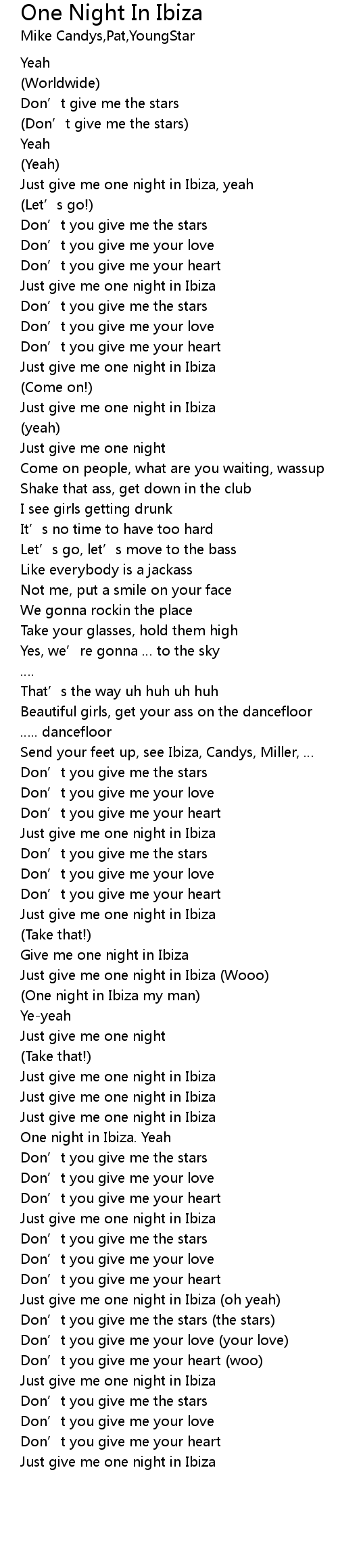 | Just give me one night in Ibiza (Wooo) | |