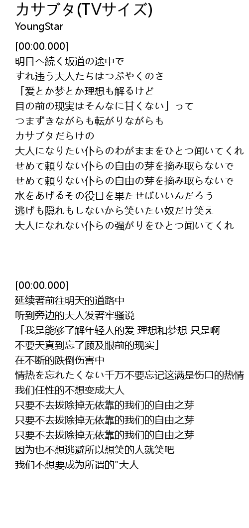 | [01:10.000] | 大人になりたい仆らのわがままをひとつ闻いてくれ |