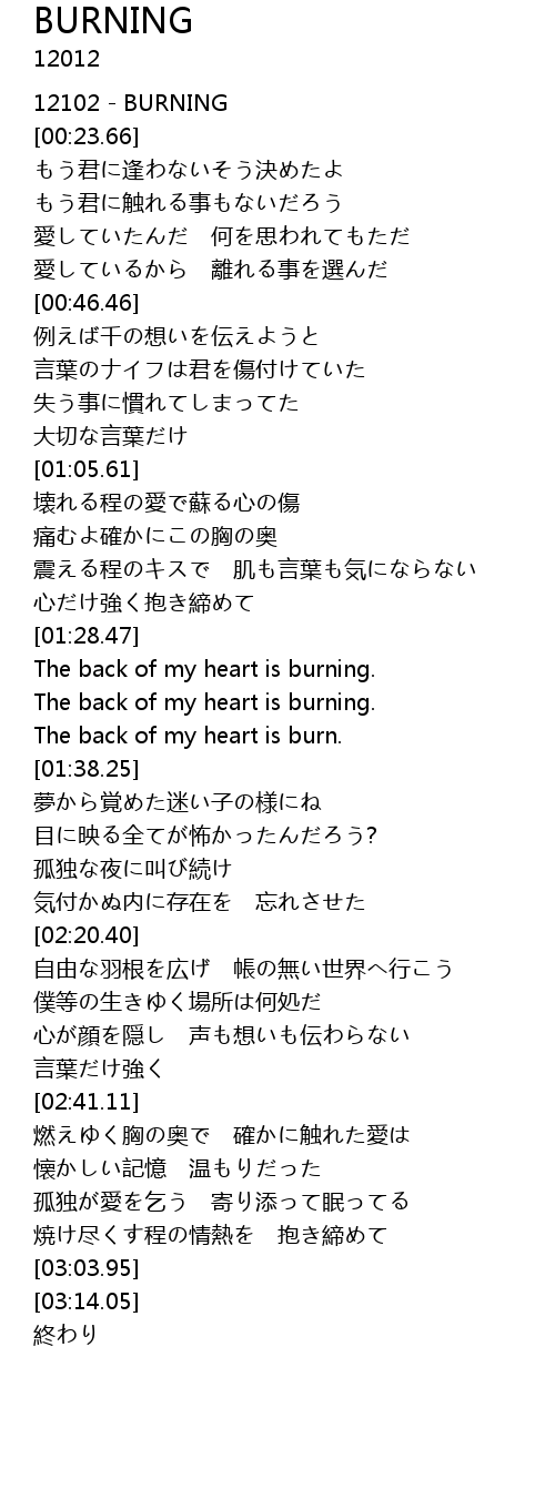 | [02:57.28] | 焼け尽くす程の情熱を 抱き締めて |