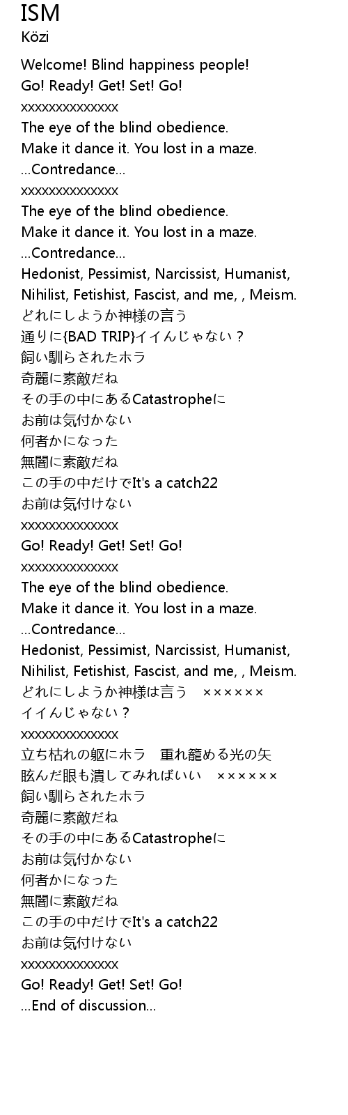 | [01:37.345] | Nihilist, Fetishist, Fascist, and me, , Meism. |
