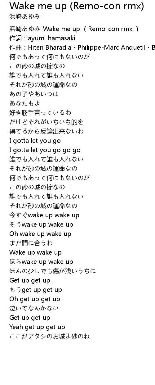 | [00:00.640] | 浜崎あゆみ-Wake me up (Remo-con rmx ) |