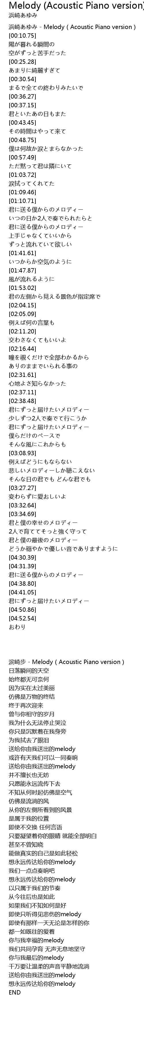 | [00:00.33] | 浜崎あゆみ - Melody(Acoustic Piano version) |
