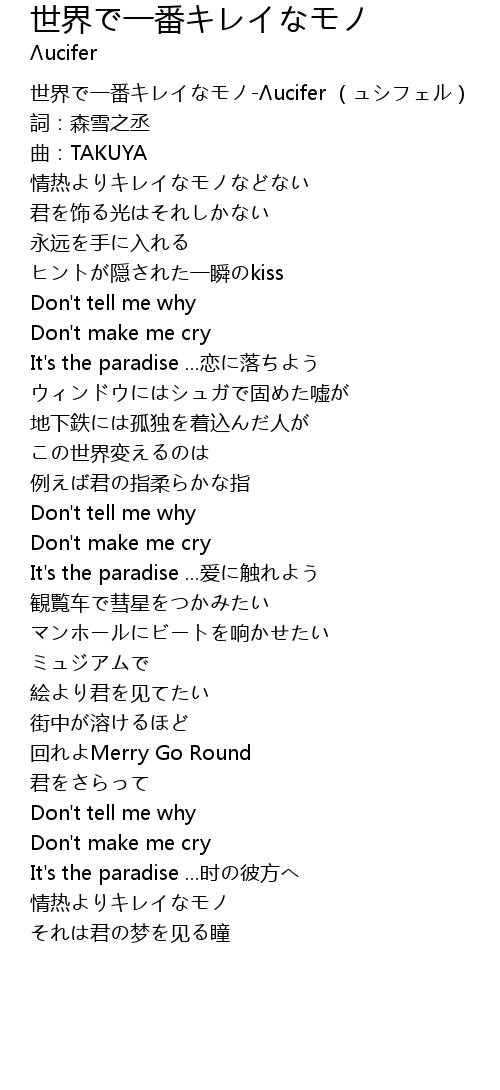 | [00:00.00] | 世界で一番キレイなモノ-Λucifer (ュシフェル) |