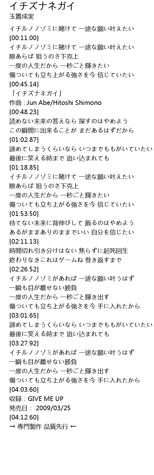 | [00:45.83] | 「イチズナネガイ」 |