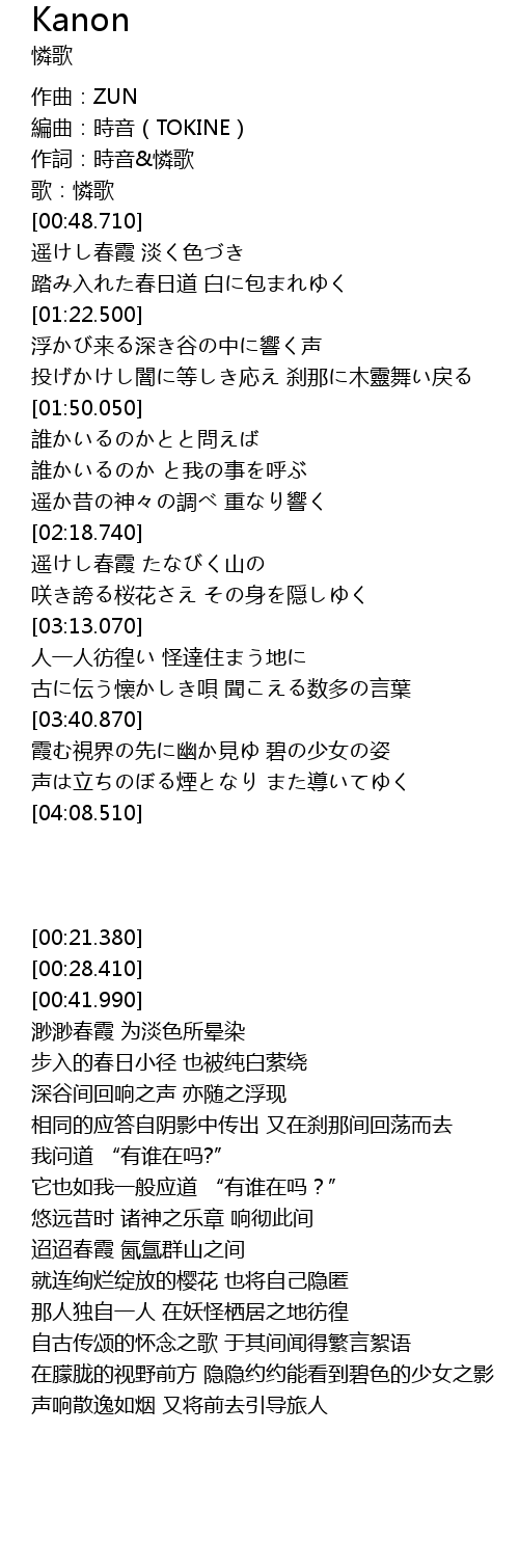 | [01:36.500] | 投げかけし闇に等しき応え 刹那に木靈舞い戻る |