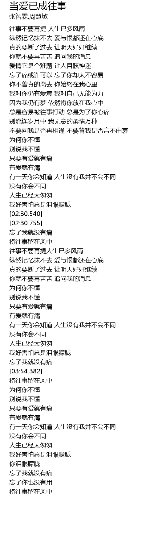 | [00:30.290] | 往事不要再提 人生已多风雨 |