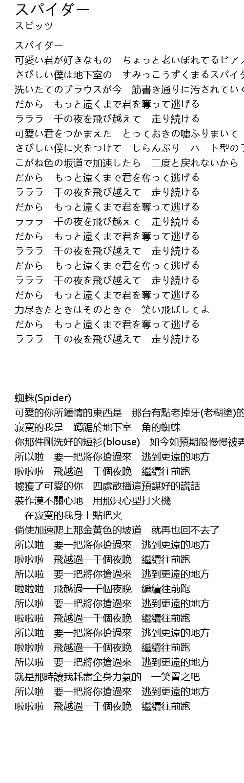| [00:23.36] | さびしい僕は地下室の すみっこうずくまるスパイダー |