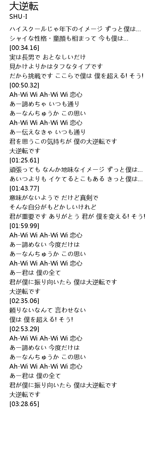 | [03:14.10] | 君が僕に振り向いたら 僕は大逆転です |