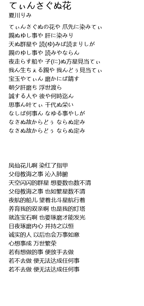 | [00:12.700] | てぃんさぐぬの花や 爪先に染みてぃ |