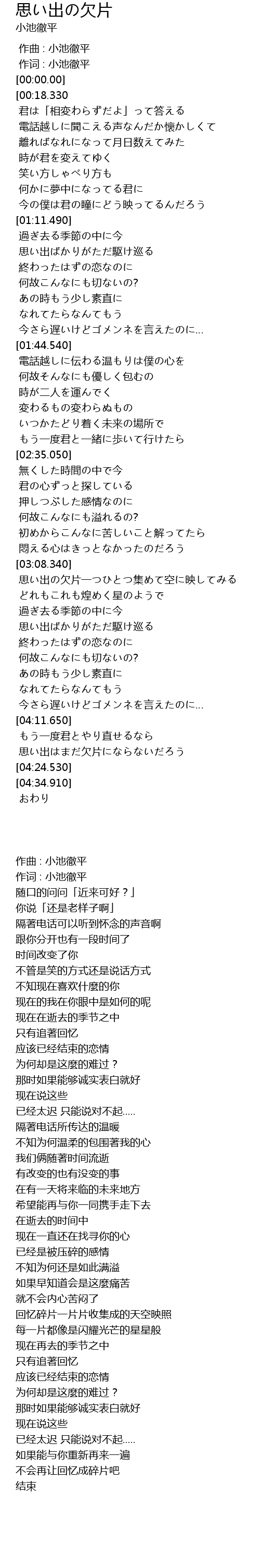 | [04:17.910] | 思い出はまだ欠片にならないだろう |