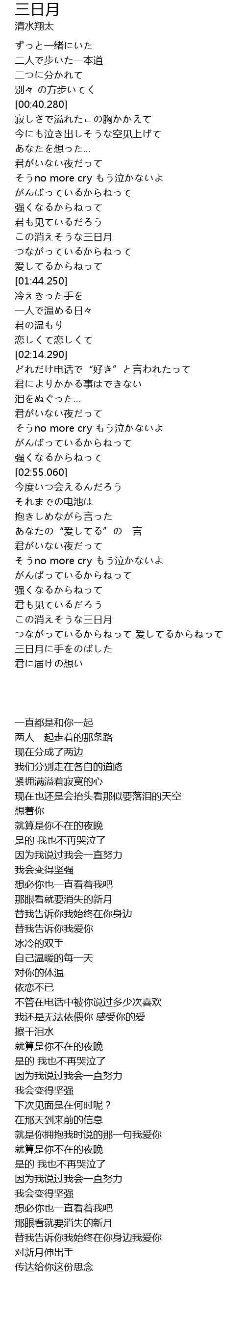 | [02:40.910] | そうno more cry もう泣かないよ |