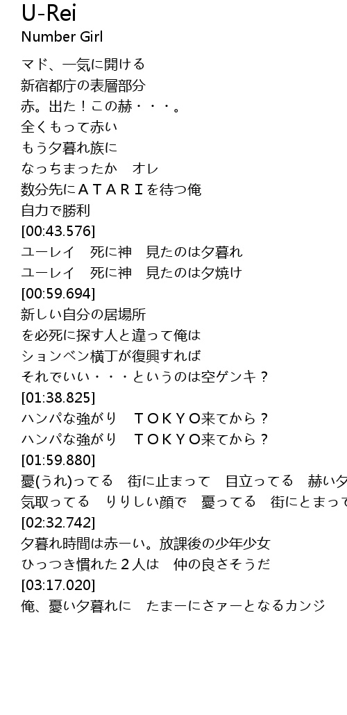 | [02:11.400] | 憂(うれ)ってる 街に止まって 目立ってる 赫い夕暮れ |