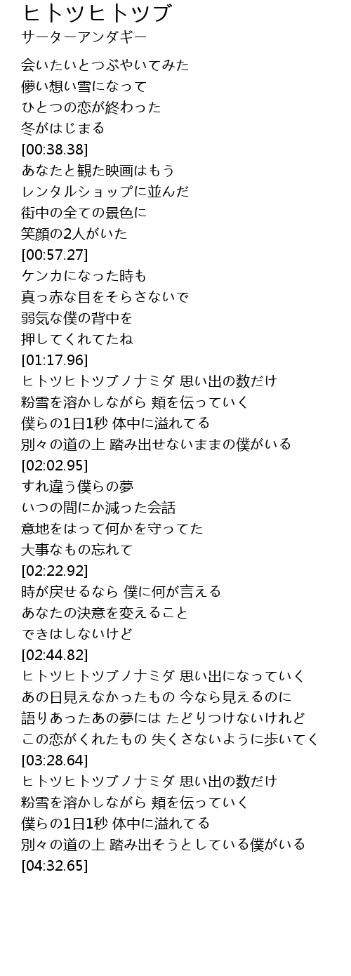 | [03:49.60] | ヒトツヒトツブノナミダ 思い出の数だけ |