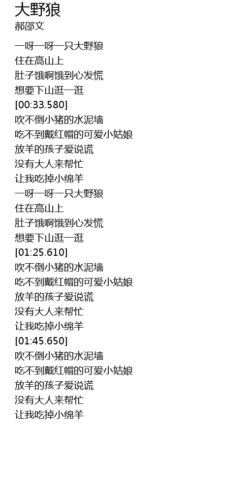 | [00:18.610] | 一呀一呀一只大野狼 |