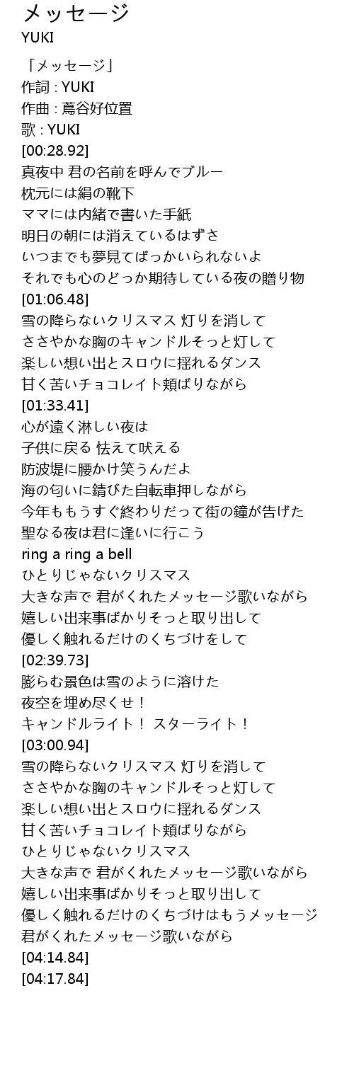 | [04:05.92] | 君がくれたメッセージ歌いながら |