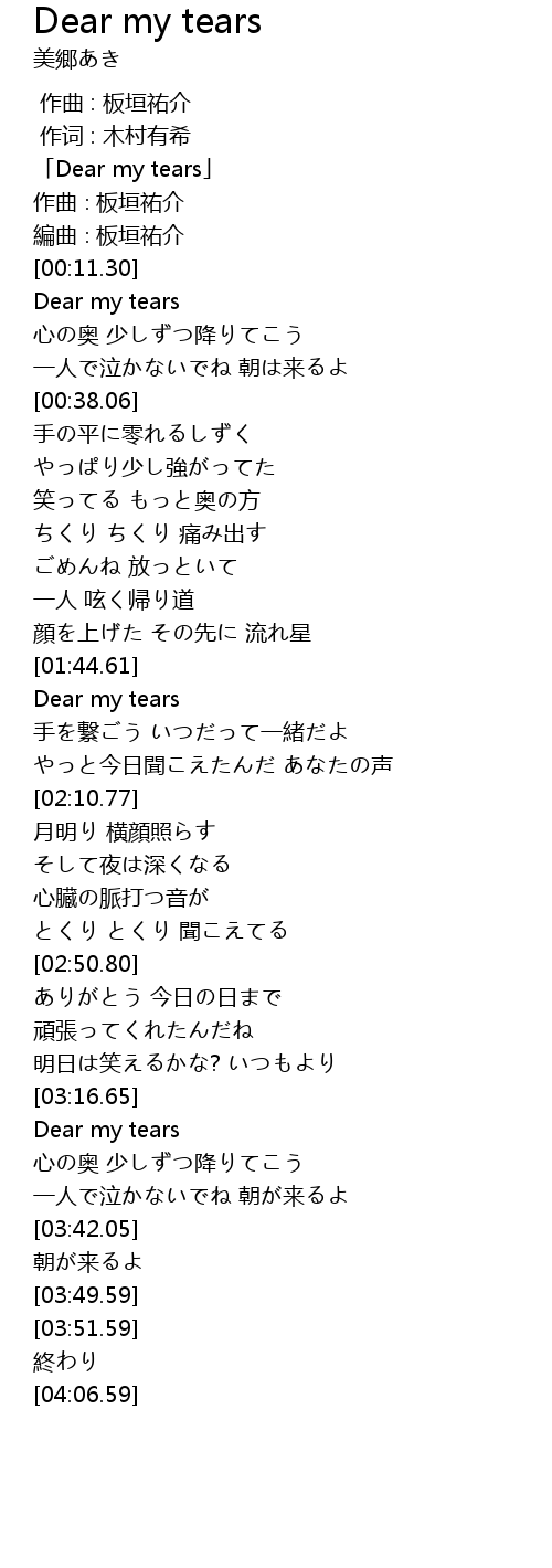 | [03:30.58] | 一人で泣かないでね 朝が来るよ |