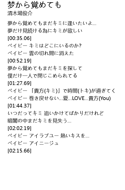 | [00:17.89] | 夢から覚めてもまだキミに逢いたいよ… |