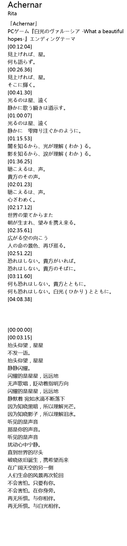 | [00:03.15] | PCゲーム『白光のヴァルーシア -What a beautiful hopes-』エンディングテーマ |