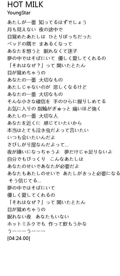 | [03:29.00] | ホットミルクでも 作って飲もうかな |