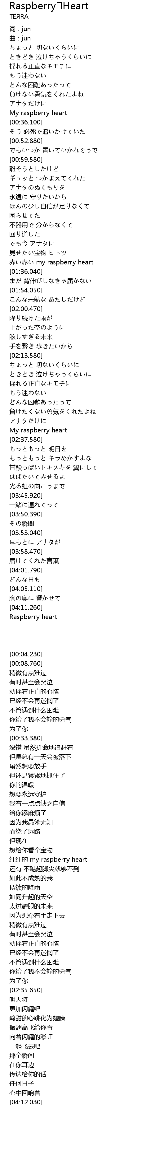 | [01:31.950] | 赤い赤い my raspberry heart |