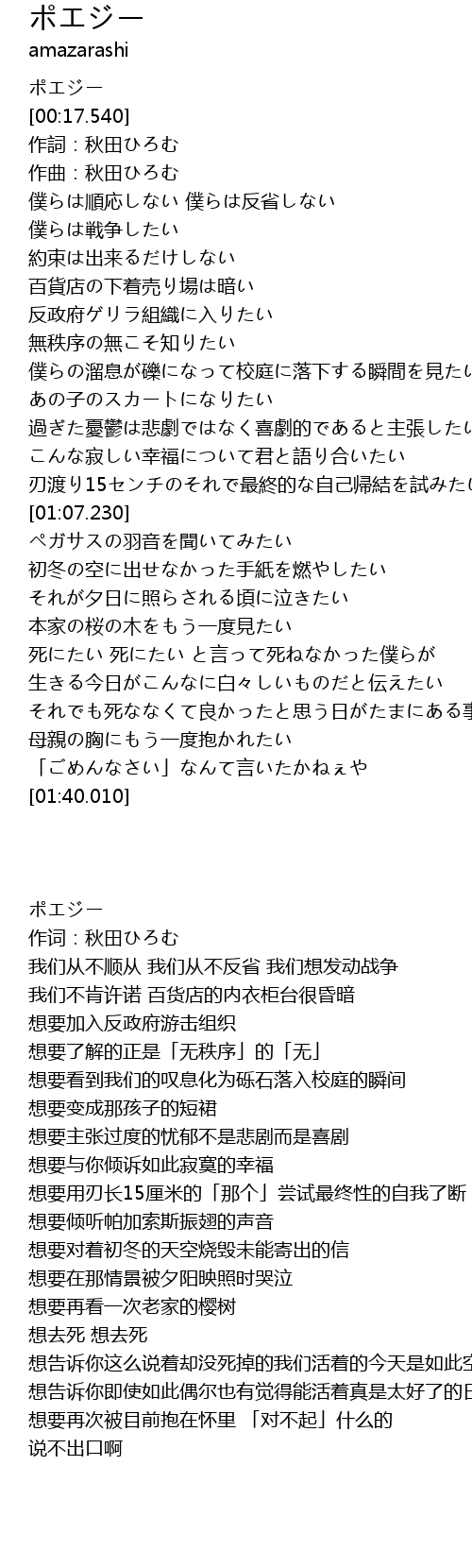 | [00:19.490] | 作詞:秋田ひろむ |