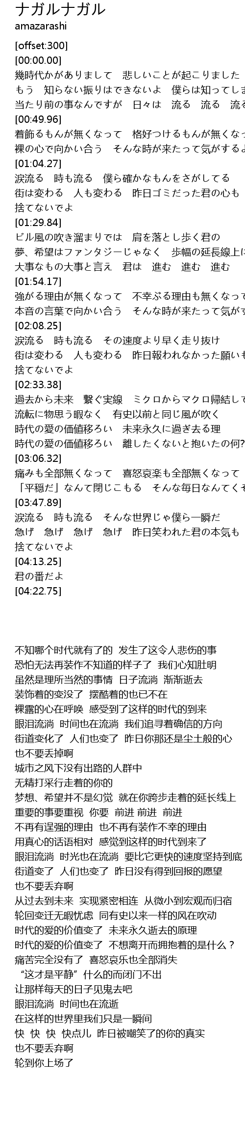 | [01:04.70] | 涙流る 時も流る 僕ら確かなもんをさがしてる |