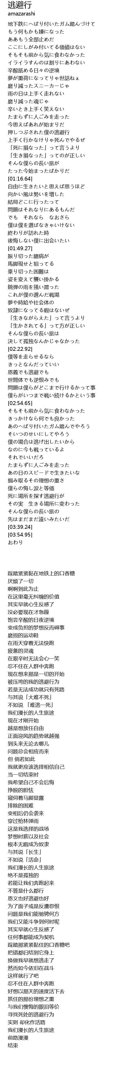 | [01:00.19] | 押しつぶされた僕の逃避行 |