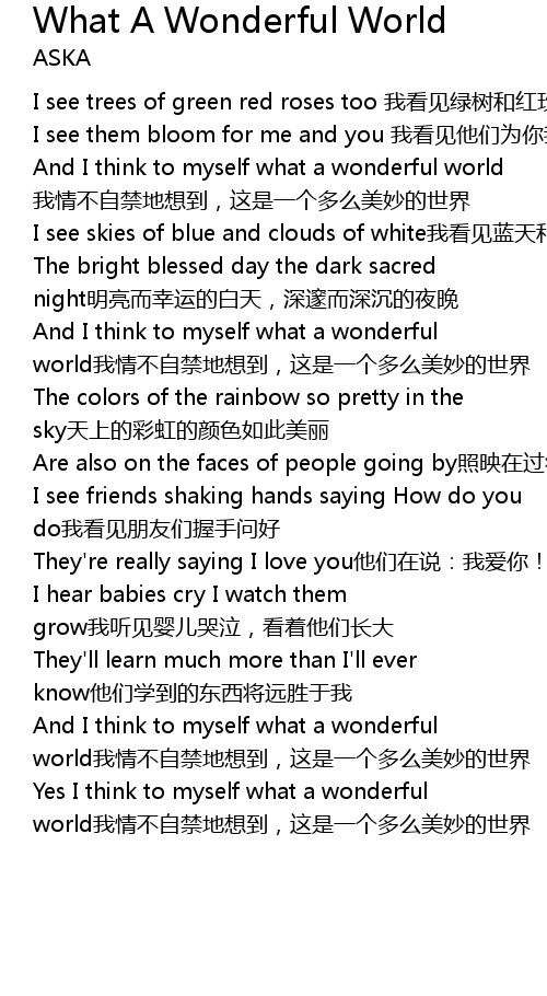 | [01:53.31] | Yes I think to myself what a wonderful world wo qing bu zi jin di xiang dao, zhe shi yi ge duo me mei miao de shi jie |