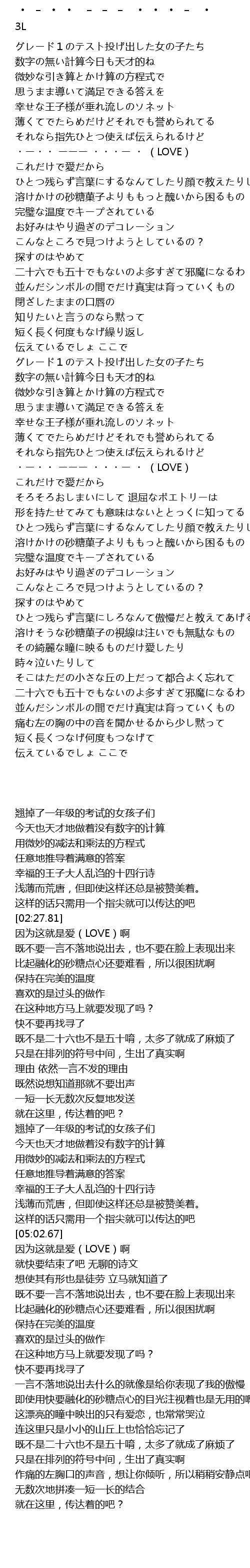 | [02:27.81] | ・ー・・ ーーー ・・・ー ・ (LOVE) |