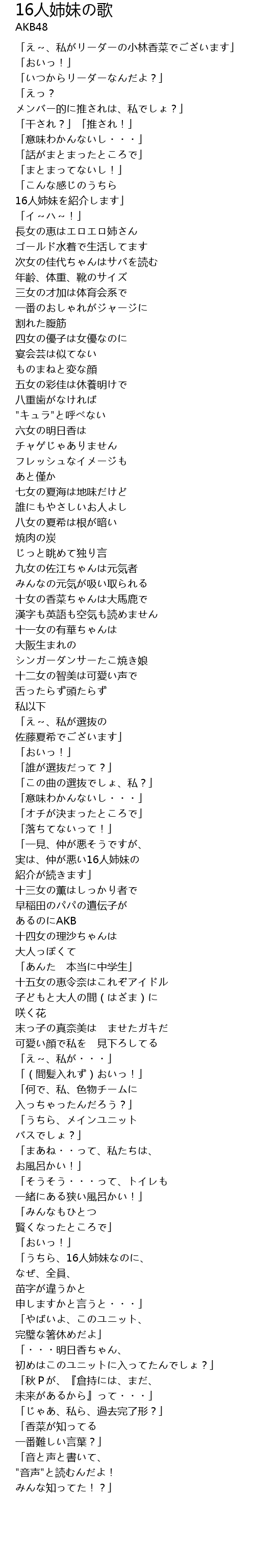 | [00:17.54] | 16人姉妹を紹介します」 |
