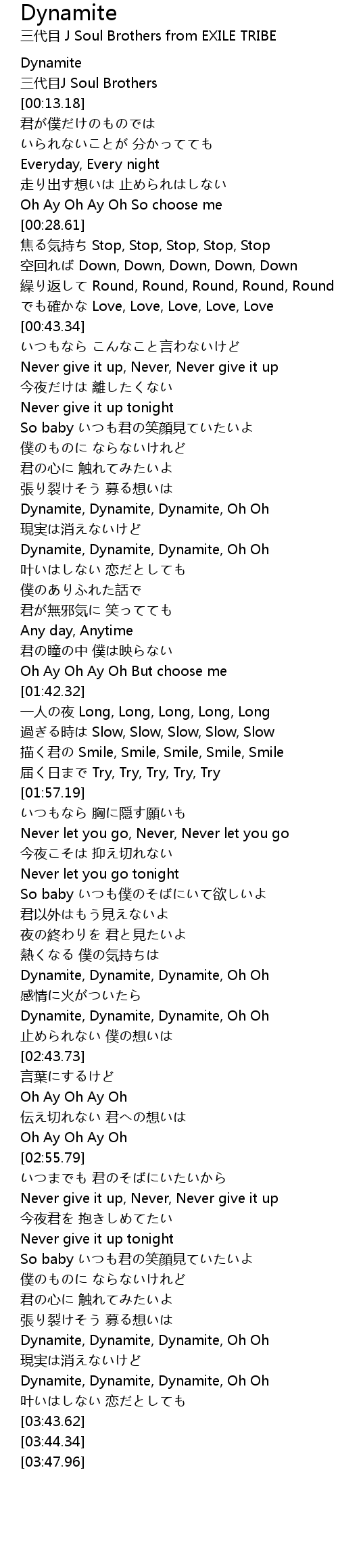 | [03:34.53] | Dynamite, Dynamite, Dynamite, Oh Oh |