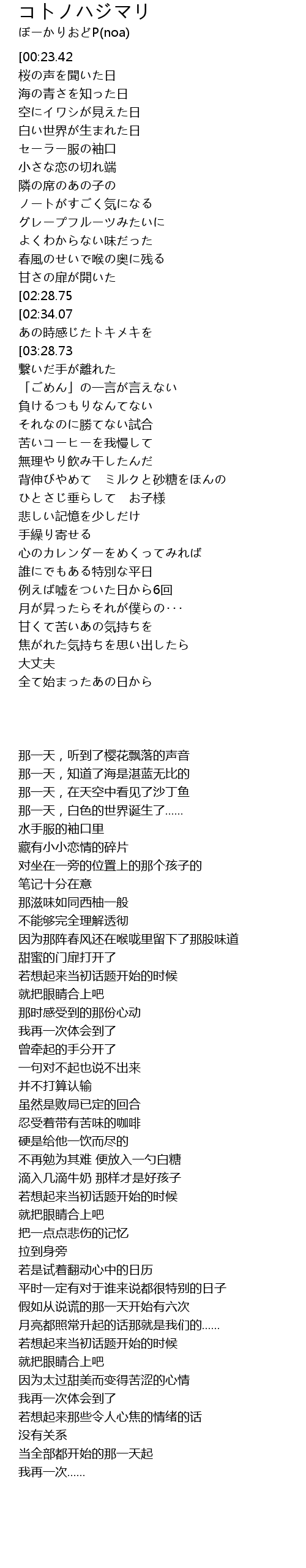 | [01:19.40][02:28.75][03:12.71] | コトノハジマリを思い出したら |