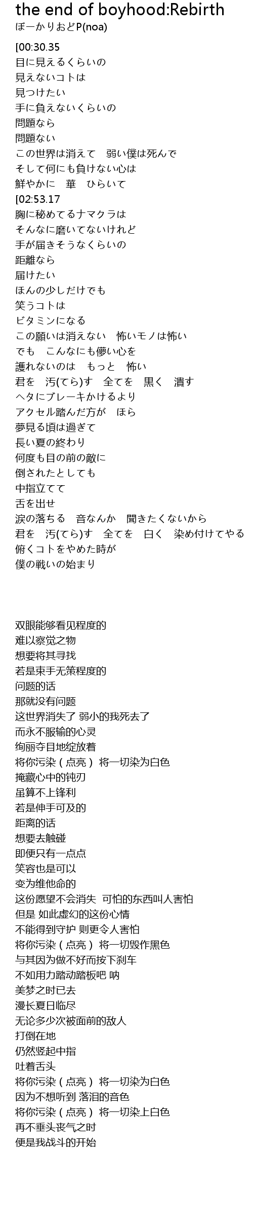 | [00:56.87][02:53.17] | 君を 汚(てら)す 全てを 白く 染める |